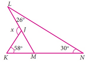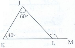 5. ΔJKL இல் ∠J = 60° மற்றும் ∠K = 40° எனில், L வழியாக KL ஐ நீட்டிப்பதால் அமையும் வெளிக்கோணத்தின் அளவைக் காண்க.