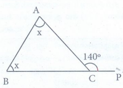4. ஒரு முக்கோணத்தில் ஒரு வெளிக்கோணம் 140° மற்றும் அதன் உள்ளெதிர்க் கோணங்கள் சமமெனில், அம்முக்கோணத்தின் அனைத்து உட்கோணங்களையும் காண்க.