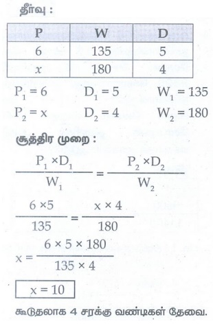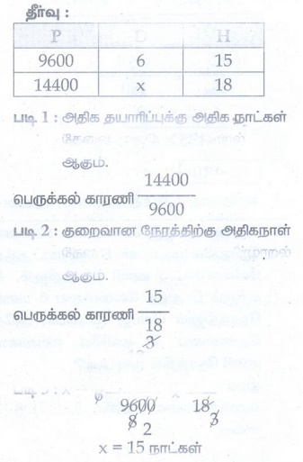 4. ஒரு சோப்புத் தொழிற்சாலையானது நாளொன்றுக்கு 15 மணி நேரம் வேலை செய்து 6 நாள்களில் 9600 சோப்புகளைத் தயாரிக்கிறது. நாளொன்றுக்கு கூடுதலாக 3 மணி நேரம் வேலை செய்து 14400 சோப்புகள் தயாரிக்க அதற்கு எத்தனை நாள்கள் ஆகும்?