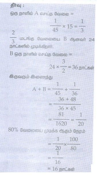 9. A ஆனவர் ஒரு வேலையை 45 நாள்களில் முடிப்பார் அவர் 15 நாள்கள் மட்டுமே வேலையைச் செய்கிறார். மீதமுள்ள வேலையை B ஆனவர் 24 நாள்களில் முடிக்கிறார் எனில், அந்த வேலையின் 80% ஐ இருவரும் இணைந்து முடிக்க ஆகும் நேரத்தைக் காண்க.