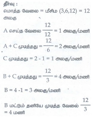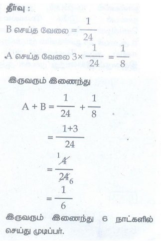 (iii) A என்பவர் ஒரு வேலையை 24 நாள்களில் முடிப்பார். A மற்றும் B ஆகியோர் ஒன்றாக இணைந்து ஒரு வேலையை 6 நாள்களில் முடிப்பர் எனில், B என்பவர் தனியே அந்த வேலையை 8 நாள்களில் முடிப்பார்.