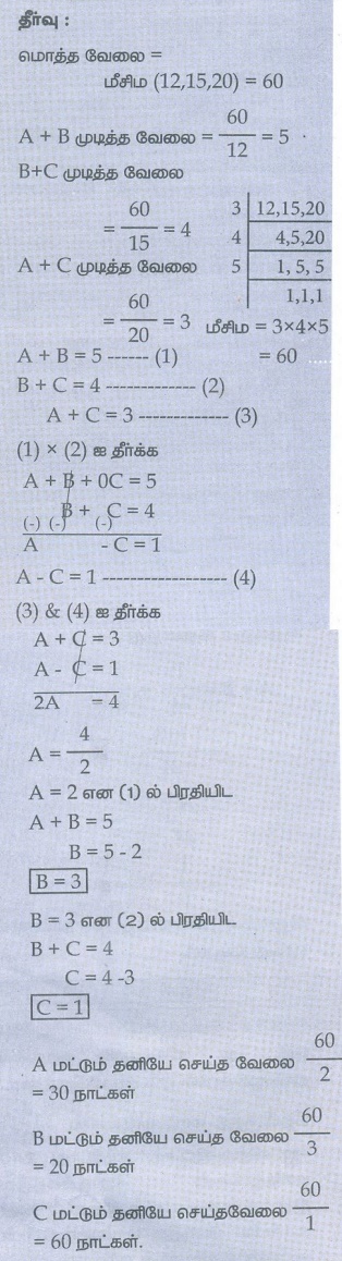 7. A மற்றும் B ஆகியோர் ஒரு வேலையை 12 நாள்களிலும் B மற்றும் C ஆகியோர் அதை 15 நாள்களிலும் A மற்றும் C ஆகியோர் அதை 20 நாள்களிலும் முடிப்பர். ஒவ்வொருவரும் தனித்தனியே அந்த வேலையை எத்தனை நாள்களில் முடிப்பர்?