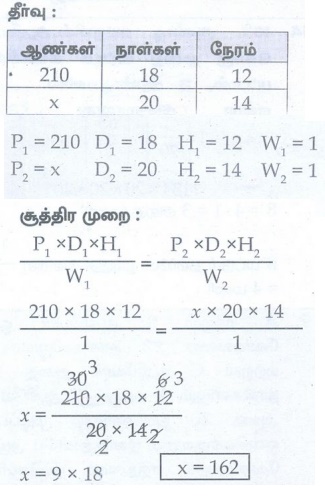 2. 210 ஆண்கள் நாளொன்றுக்கு 12 மணி நேரம் வேலை செய்து ஒரு வேலையை 18 நாள்களில் முடிப்பர். அதே வேலையை நாளொன்றுக்கு 14 மணி நேரம் வேலை செய்து, 20 நாள்களில் முடிக்க எத்தனை ஆண்கள் தேவை?
