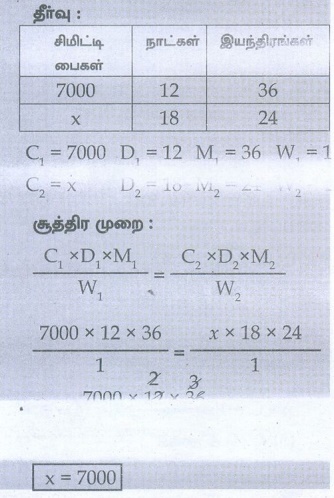 3. ஒரு சிமிட்டி தொழிற்சாலையானது 36 இயந்திரங்களின் உதவியுடன் 12 நாள்களில் 7000 சிமிட்டி பைகளைத் தயாரிக்கிறது. 24 இயந்திரங்களைப் பயன்படுத்தி 18 நாள்களில் எத்தனை சிமிட்டி பைகளைத் தயாரிக்கலாம்?
