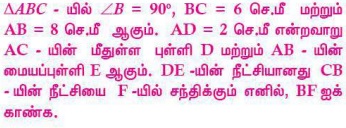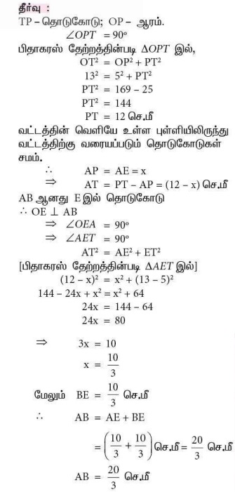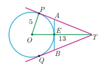 6. கொடுக்கப்பட்ட படத்தில் O- வை மையமாக உடைய வட்டத்தின் ஆரம் 5 செ.மீ ஆகும். T-யானது OT = 13 செ.மீ என அமைந்த ஒரு புள்ளி மற்றும் OT-யானது வட்டத்தை E-யில் வெட்டுகிறது. வட்டத்தில் E என்ற புள்ளியின் வழியாகச் செல்லும் ஒரு தொடுகோடு A B எனில், A B-யின் நீளம் காண்க.