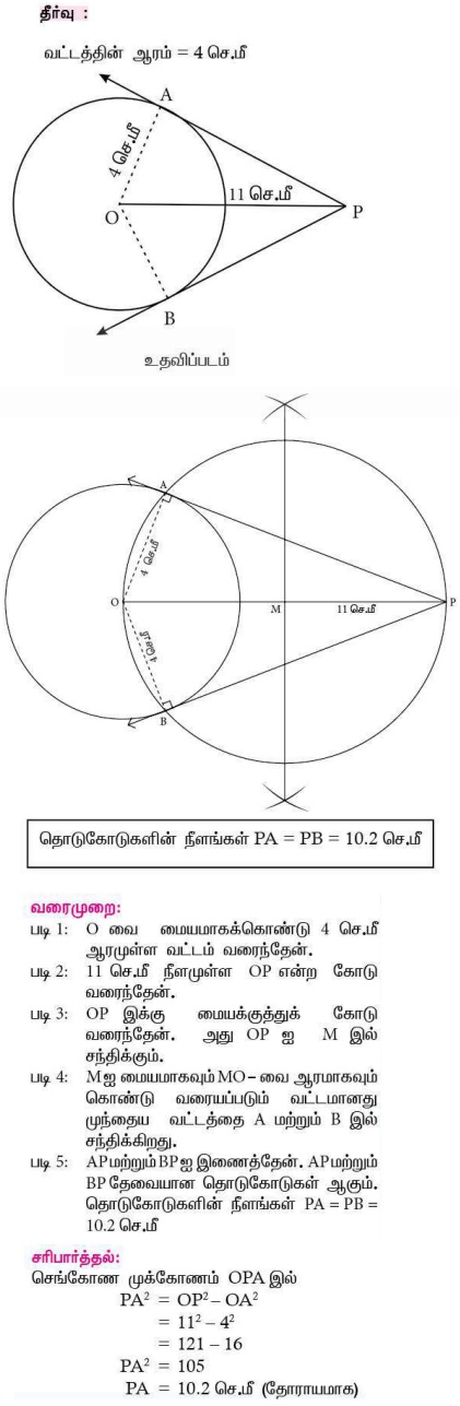 14. 4 செ.மீ ஆரமுள்ள வட்டம் வரைந்து அதன் மையத்திலிருந்து 11 செ.மீ தொலைவிலுள்ள ஒரு புள்ளியைக் குறித்து, அப்புள்ளியிலிருந்து வட்டத்திற்கு இரண்டு தொடுகோடுகள் வரைக.