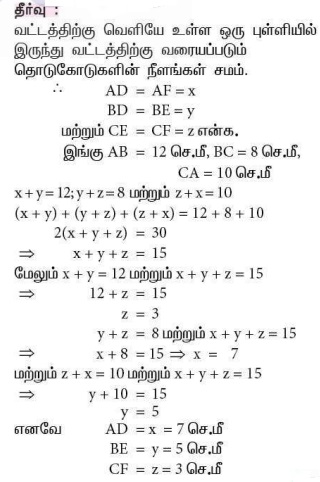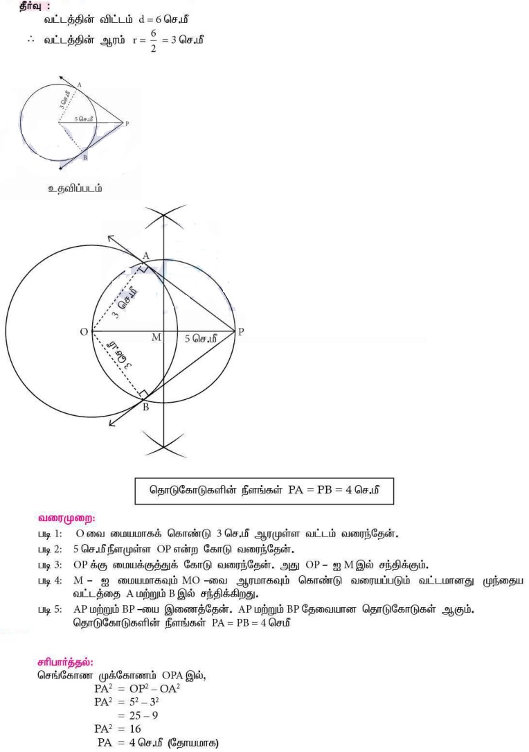15. 6 செ.மீ விட்டமுள்ள வட்டம் வரைந்து வட்டத்தின் மையத்திலிருந்து 5 செ.மீ தொலைவிலுள்ள ஒரு புள்ளியைக் குறிக்கவும். அப்புள்ளியிலிருந்து வட்டத்திற்குத் தொடுகோடுகள் வரைந்து, தொடுகோட்டின் நீளங்களைக் கணக்கிடுக.