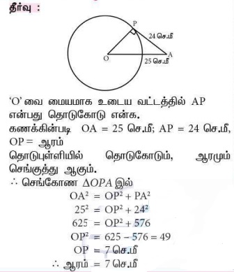 1. வட்டத்தின் மையத்திலிருந்து 25 செ.மீ தொலைவில் உள்ள P என்ற புள்ளியிலிருந்து வட்டத்திற்கு வரையப்பட்ட தொடுகோட்டின் நீளம் 24 செ.மீ எனில், வட்டத்தின் ஆரம் என்ன?