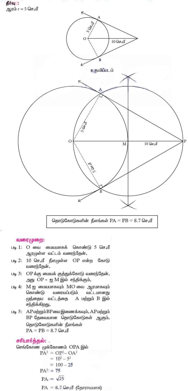 13. 5 செ.மீ ஆரமுள்ள வட்டத்தின் மையத்திலிருந்து 10 செ.மீ தொலைவிலுள்ள புள்ளியிலிருந்து வட்டத்திற்குத் தொடுகோடுகள் வரையவும். மேலும் தொடுகோட்டின் நீளங்களைக் கணக்கிடுக.