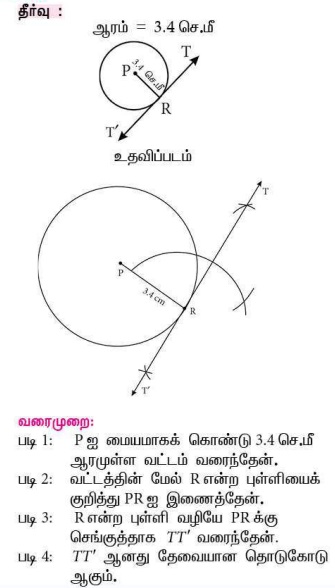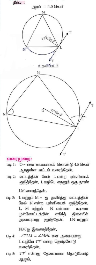 12. 4.5 செ.மீ ஆரமுள்ள வட்டம் வரைக. வட்டத்தின் மீது ஏதேனும் ஒரு புள்ளிக்கு மாற்று வட்டத்துண்டு தேற்றத்தினைப் பயன்படுத்தித் தொடுகோடு வரைக.