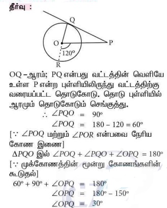 4. O -வை மையமாக உடைய வட்டத்திற்கு P –யிலிருந்து வரையப்பட்ட தொடுகோடு PQ. QOR ஆனது விட்டம் ஆகும். வட்டத்தில் ∠POR = 120° எனில், ∠OPQ -ஐக் காண்க.