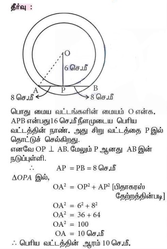 7. இரண்டு பொது மைய வட்டங்களில், 16 செ.மீ நீளமுடைய பெரிய வட்டத்தின் நாணானது 6 செ.மீ ஆரமுள்ள சிறிய வட்டத்திற்குத் தொடுகோடாக அமைந்தால், பெரிய வட்டத்தின் ஆரம் காண்க.