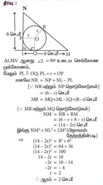 2. செங்கோண முக்கோணம் LMN -யில் ∠L = 90° ஆகும். ஒரு வட்டமானது செங்கோண முக்கோணத்தின் உள்ளே அதன் பக்கங்களைத் தொடுமாறு வரையப்படுகிறது. செங்கோணத்தைத் தாங்கும் பக்கங்களின் நீளங்கள் 6 செ.மீ மற்றும் 8 செ.மீ எனில், வட்டத்தின் ஆரம் காண்க.