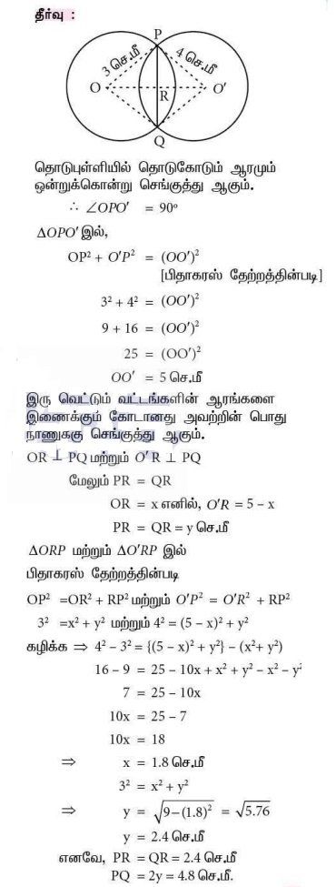 8. O மற்றும் O' -ஐ மையப் புள்ளிகளாகக் கொண்ட இரு வட்டங்களின் ஆரங்கள் முறையே 3 செ.மீ மற்றும் 4 செ.மீ ஆகும். இவை இரண்டும் P, Qஎன்ற புள்ளிகளில் வெட்டிக்கொள்கின்றன. OP மற்றும் O'P ஆகியவை வட்டங்களின் இரு தொடுகோடுகள் எனில், பொது நாண் PQ -யின் நீளம் காண்க.