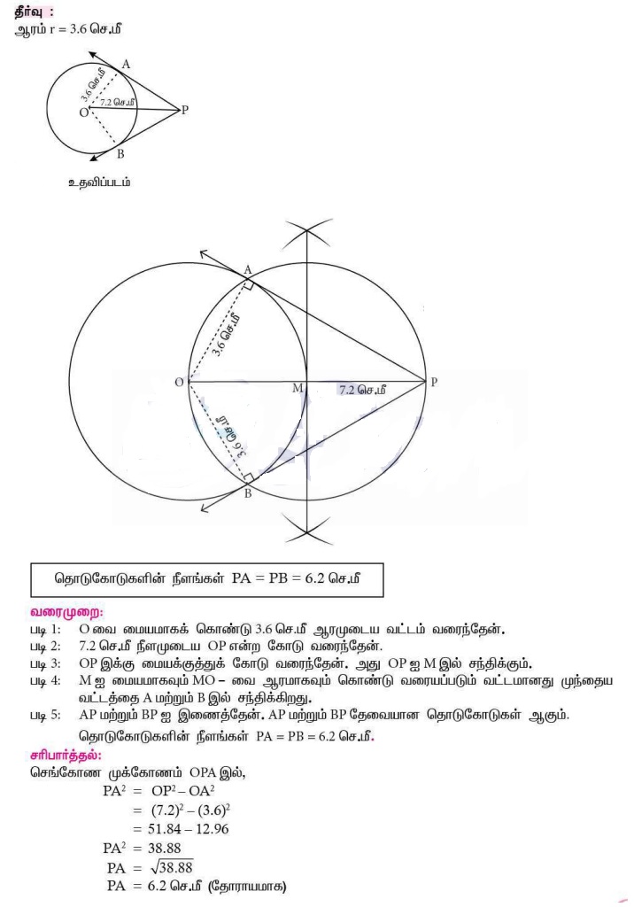 16. O -வை மையமாகக் கொண்ட 3.6 செ.மீ ஆரமுள்ள வட்டம் வரைக. வட்டத்தின் மையத்திலிருந்து 7.2 செ.மீ தொலைவிலுள்ள P என்ற புள்ளியைக் குறித்து அப்புள்ளியிலிருந்து வட்டத்திற்குத் தொடுகோடுகள் வரைக.