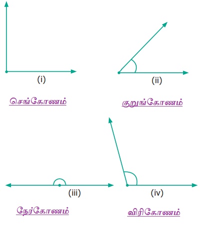 4. கோணமானியைப் பயன்படுத்திக் கொடுக்கப்பட்ட படத்திலுள்ள கோணங்களை அளக்க. அவற்றைக் குறுங்கோணம், விரிகோணம், செங்கோணம் அல்லது நேர்க்கோணம் என வகைப்படுத்துக.