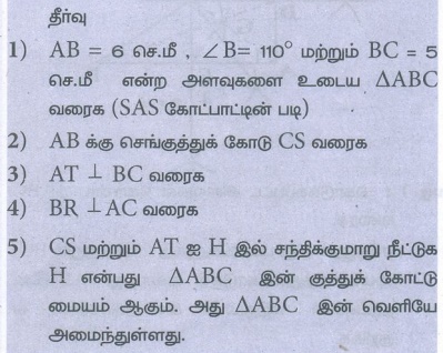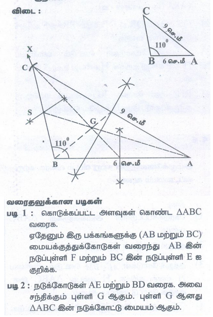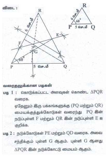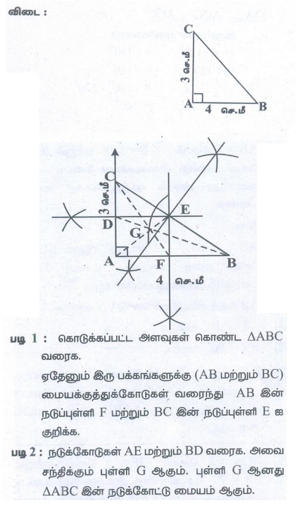 அளவுகளுள்ள ∆ABC வரைந்து அதன் நடுக்கோட்டு மையத்தைக் குறிக்க.