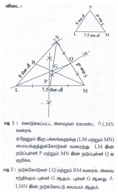 1. LM = 7.5 செமீ, MN = 5செமீ மற்றும் LN = 8 செமீ அளவுகளுக்கு ∆LMN வரைந்து அதன் நடுக்கோட்டு மையத்தைக் குறிக்கவும்.
