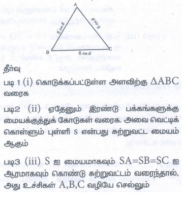 1. AB = 8 செமீ, BC = 6 செமீ மற்றும் ∠B = 70°அளவுள்ள ABC வரைந்து, அம்முக்கோணத்தின் சுற்றுவட்டம் வரைக. சுற்றுவட்ட மையம் காண்க.