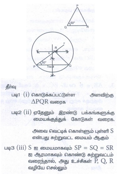 4. QR = 7 செமீ, ∠Q = 50° மற்றும் PQ = PR அளவுகள் கொண்ட இருசமபக்க ∆PQR வரைக. மேலும், ∆PQR இன் சுற்றுவட்ட மையம் வரைக.
