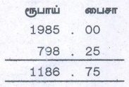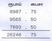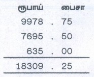 5. அருண் என்பவர் ஒரு நகைக் கடையில் வெவ்வேறு எடைகளில் தங்க நாணயங்களை வாங்கினார். அந்த தங்க நாணயங்களின் விலைகள் முறையே ₹ 18965.75, ₹ 26998.00 மற்றும் ₹ 3589.50 எனில், அருண் வாங்கிய தங்க நாணயங்களின் மொத்த விலையைக் காண்க.