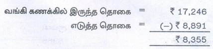 8. ஒரு நபரின் சேமிப்புக் கணக்கில் ₹ 17,246 இருந்தது. அதிலிருந்து அவர் வீட்டு வாடகைக்காக ₹ 8,891 எடுத்தார் எனில், அவரது சேமிப்புக் கணக்கில் எவ்வளவுத் தொகை மீதமிருக்கும்?