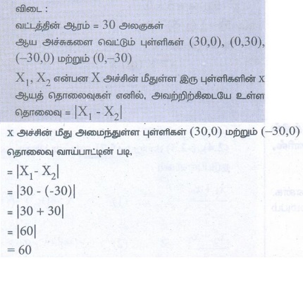 12. ஆதிப் புள்ளியை மையமாக உடைய வட்டத்தின் ஆரம் 30 அலகுகள். அந்த வட்டம் ஆய அச்சுகளை வெட்டும் புள்ளிகளைக் காண்க. இவ்வாறான எந்த இரு புள்ளிகளுக்கும் இடையே உள்ள தொலைவைக் காண்க.