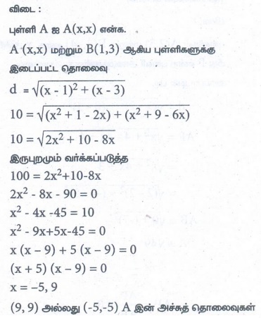 அச்சுத் தொலைவிற்குச் சமம். மேலும், B(1, 3) என்ற புள்ளியிலிருந்து அப்புள்ளி A ஆனது 10 அலகு தொலைவில் இருக்கிறது. எனில் A இன் அச்சுத் தொலைவுகளைக் காண்க.
