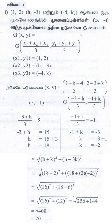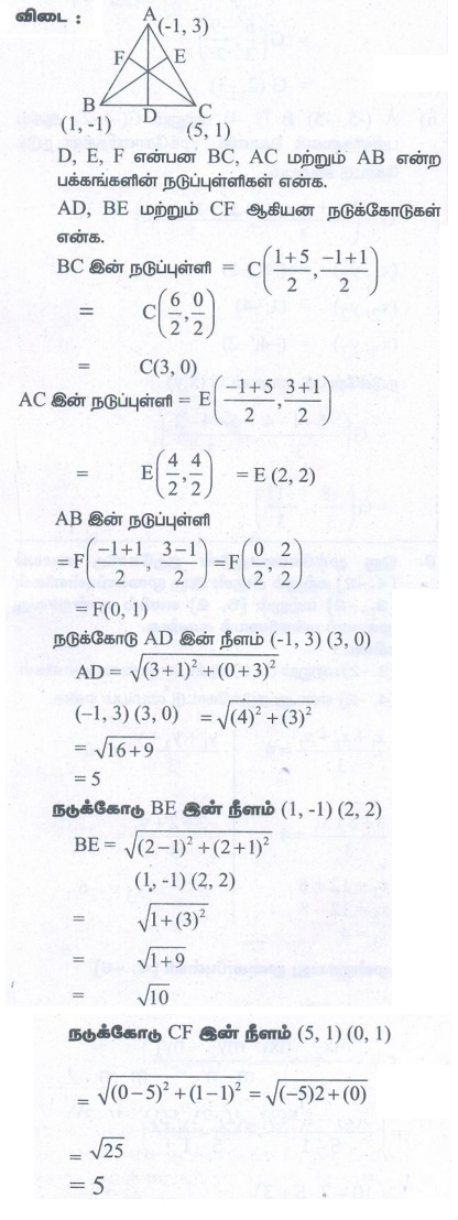 3. A( −1,3), B(1, −1) மற்றும் C(5,1) ஆகியன ஒரு முக்கோணத்தின் முனைப்புள்ளிகள் எனில் A வழியே செல்லக் கூடிய நடுக்கோட்டின் நீளத்தைக் காண்க.