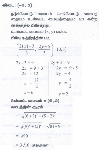 5. A( −3,5) மற்றும் B(3,3) ஆகியன முறையே ஒரு முக்கோணத்தின் செங்கோட்டு மையம் மற்றும் நடுக்கோட்டு மையம் ஆகும். C ஆனது இந்த முக்கோணத்தின் சுற்று வட்ட மையம் எனில், கோட்டுத் துண்டு AC ஐ விட்டமாகக் கொண்ட வட்டத்தின் ஆரம் காண்க.