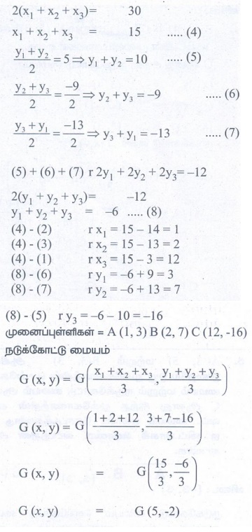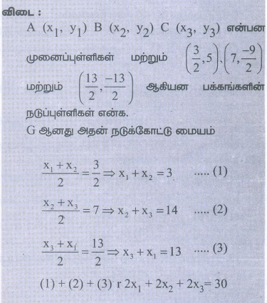7. முக்கோணத்தின் பக்கங்களின் நடுப்புள்ளிகள் (3/2 , 5) , (7 , −9/2) மற்றும் (13/2 , −13/2) எனில் அந்த முக்கோணத்தின் நடுக்கோட்டு மையம் காண்க.