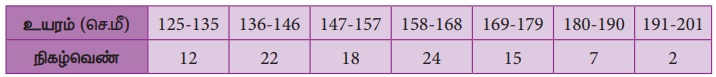 6. 100 பேரின் உயரங்களின் பரவல் கீழேக் கொடுக்கப்பட்டுள்ளது. எனில், நிகழ்வுச் செவ்வகத்தின் மீதுள்ளவாறு நிகழ்வுப் பலகோணம் வரைக.