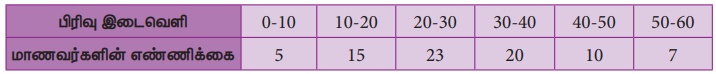 (i) பிரிவு அளவு 10 மதிப்பெண்கள் என எடுத்துக்கொண்டு நிகழ்வெண் பரவல் அட்டவணையைத் தயார் செய்க