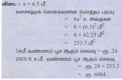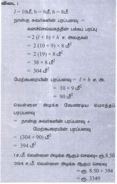 கூடத்தின் அளவு 10 மீ × 9 மீ × 8 மீ என்றவாறு உள்ளது. அக்கூடத்தின் சுவர்கள் மற்றும் மேற்கூரைக்கு வெள்ளையடிக்க ஒரு சதுர மீட்டருக்கு ₹8.50 வீதம் ஆகும் மொத்தச் செலவைக் காண்க.