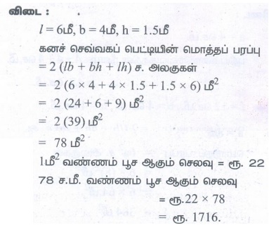 கனச்செவ்வக வடிவப் பெட்டியின் அளவுகளானது 6 மீ × 400 செமீ × 1.5 மீ ஆகும். அப்பெட்டியின் வெளிப்புறம் முழுவதும் வண்ணம் பூசுவதற்கு 1 சதுர மீட்டருக்கு ₹22 வீதம் ஆகும் எனில், மொத்தச் செலவைக் காண்க.