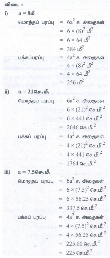 பக்க அளவைக் கொண்ட கனச்சதுரங்களின் மொத்தப்பரப்பு மற்றும் பக்கப்பரப்பைக் காண்க. (i) 8 மீ (ii) 21 செமீ (iii) 7.5 செமீ
