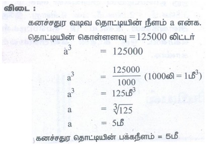 கனச்சதுர வடிவிலான பால் தொட்டியானது 1,25,000 லிட்டர் கொள்ளளவைக் கொண்டுள்ளது. அத்தொட்டியின் பக்க நீளத்தை மீட்டரில் காண்க.