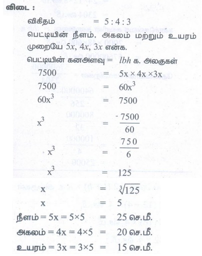 சாக்லேட் பெட்டியின் நீளம், அகலம் மற்றும் உயரம் முறையே 5:4:3 என்ற விகிதத்தில் உள்ளது. அதன் கன அளவு 7500 செமீ3