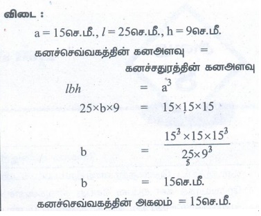 9. 15 செமீ பக்க அளவுள்ள ஓர் உலோகத்தால் ஆன கனச்சதுரமானது உருக்கப்பட்டு ஒரு கனச்செவ்வகமாக உருவாக்கப்படுகிறது. கனச்செவ்வகத்தின் நீளம் மற்றும் உயரம் முறையே 25 செமீ மற்றும் 9 செமீ எனில் அதன் அகலத்தைக் காண்க.