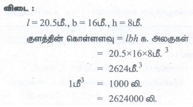 குளத்தின் நீளம், அகலம் மற்றும் ஆழம் முறையே 20.5 மீ, 16 மீ மற்றும் 8 மீ எனில், அந்தக் குளத்தின் கொள்ளளவை லிட்டரில் காண்க.