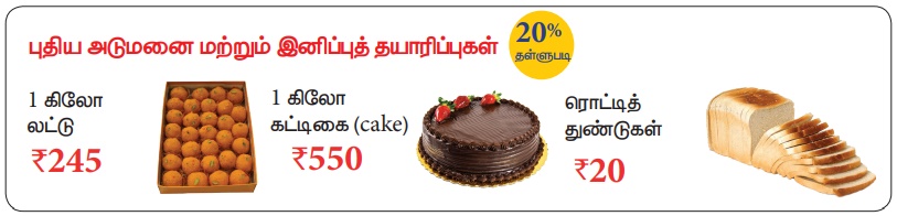 2. பின்வரும் பொருள்களை வாங்குவதற்கு, புதிய அடுமனை மற்றும் இனிப்புத் தயாரிப்புகளின் சிறப்புச் சலுகை விலையில் வாங்கினால் மொத்தமாக நீங்கள் செலவழிக்கும் தொகை எவ்வளவு? ½ கிலோ லட்டு, 1 கிலோ கட்டிகை (cake), 6 ரொட்டித் துண்டுகள்.