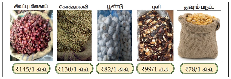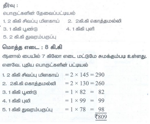 4. படத்தில் கொடுக்கப்பட்டிருக்கும் மளிகைப் பொருள்களை கையில் வைத்திருக்கும் ₹1000 இக்குள் வாங்க விரும்புகிறீர்கள். மேலும் உங்களிடம் 7 கிலோ எடையை சுமக்கும் கை பை உள்ளது எனில், 1 கி.கி பொருளுக்கான அதிகபட்ச விலையின் அடிப்படையில் பொருள்களை அட்டவணைப்படுத்தி 7 கிலோவிற்கு மிகாமல் நீங்கள் கையில் வைத்திருக்கும் பணத்திற்கு அதிகபட்சமாக செலவிடும் தொகை எவ்வளவு எனக் கணக்கிடுக.
