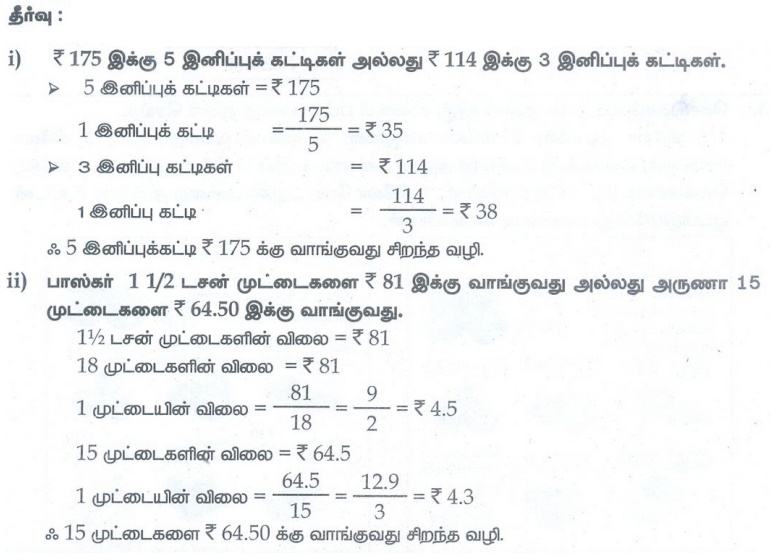 (ii) பாஸ்கர் 1½ டசன் முட்டைகளை ₹81 இக்கு வாங்குவது அல்லது அருணா 15 முட்டைகளை ₹64.50 இக்கு வாங்குவது.