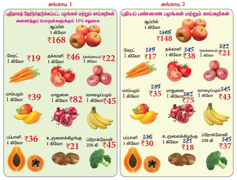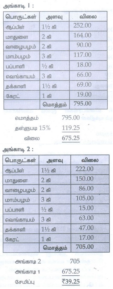 1 ½ கிலோ ஆப்பிள், 2 கிலோ மாதுளை, 2 கிலோ வாழைப்பழம், 3 கிலோ மாம்பழம், வாங்கத் திட்டமிட்டு அவை அங்காடி 1 இல் ½ கிலோ பப்பாளி, 3 கிலோ வெங்காயம், 1 ½ கிலோ தக்காளி, 1 கிலோ கேரட், ஆகியவற்றை அங்காடி 2 உடன் ஒப்பிடும்போது எவ்வளவு சேமிப்பீர்கள்.