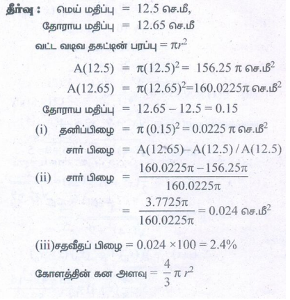 4. ஒருவட்ட வடிவ தகட்டின் ஆரம் 12.65 செமீ-க்குப் பதிலாக 12.5 செமீஎன அளக்கப்படுகின்றது எனில் அதன் பரப்பு கணக்கிடுவதில் பின்வருவனவற்றை காண்க: