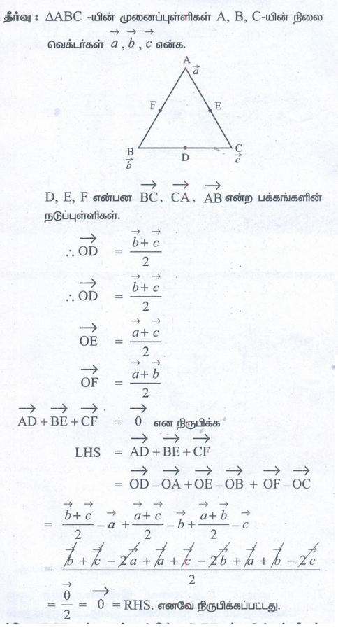 (11) A, B, C ஆகியவை ஒரு முக்கோணத்தின் முனைப்புள்ளிகள் மற்றும் D,E,F என்பவை BC, CA, AB ஆகியவற்றின் மையப்புள்ளிகள் எனில், என நிறுவுக.