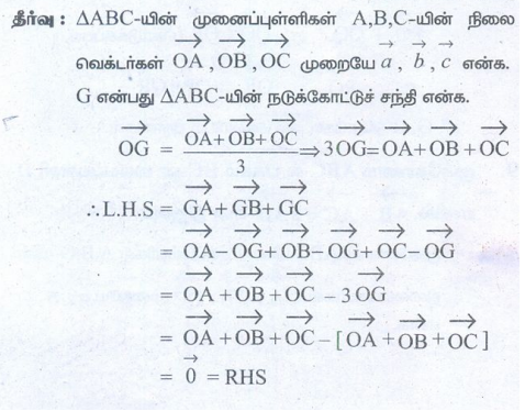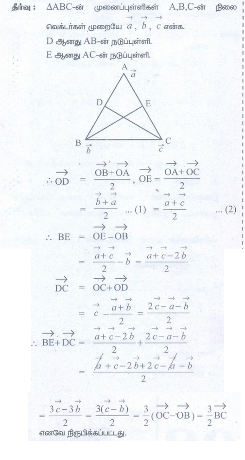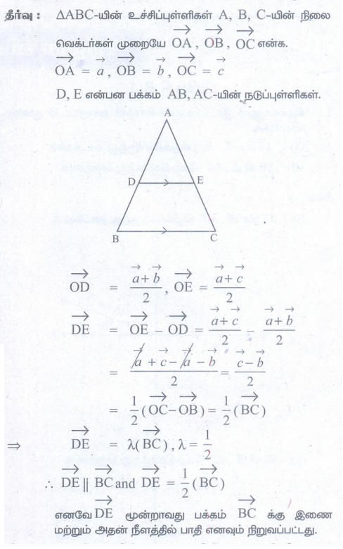 (5) ஒரு முக்கோணத்தின் இரு பக்கங்களின் நடுப்புள்ளிகளைச் சேர்க்கும் நேர்க்கோடு அதன் மூன்றாவது பக்கத்திற்கு இணை எனவும், அதன் நீளத்தில் பாதி எனவும் வெக்டர் முறையில் நிறுவுக.