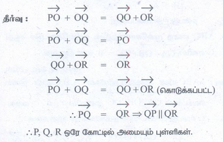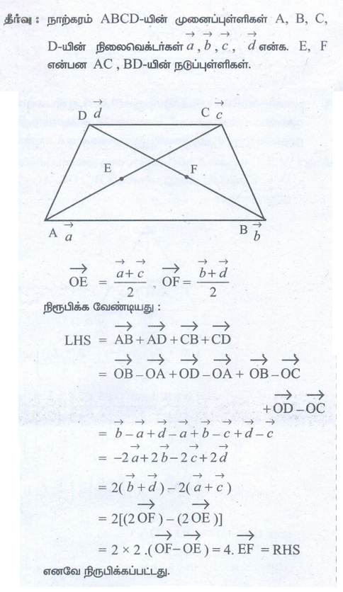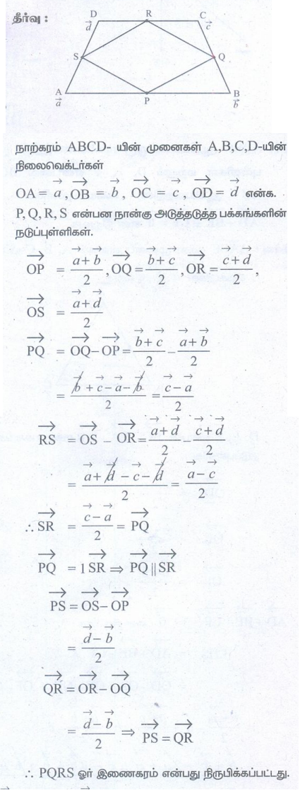 (6) ஒரு நாற்கரத்தின் பக்கங்களின் நடுப்புள்ளிகளைச் சேர்க்கும் நேர்க்கோடுகள் ஒரு இணைகரத்தை அமைக்கும் என வெக்டர் முறையில் நிறுவுக.