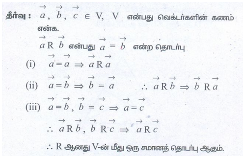 (2) தொடர்பு R ஆனது V என்ற வெக்டர்களின் கணத்தின் மீது என வறையறுக்கப்பட்டால் அது V−ன் மீது ஒரு சமானத் தொடர்பு என நிறுவுக.