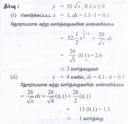 9. ஒரு மனிதன் x மணி நேரத்தில் கற்கும் y வார்த்தைகளுக்கான தொடர்பு y = 52√x, 0 ≤ x ≤ 9 எனக் கொடுக்கப்பட்டுள்ளது. x-ன் மதிப்பு பின்வருமாறு மாறும்போது கற்றல் வார்த்தைகளின் எண்ணிக்கையில் ஏற்படும் தோராய மாற்றத்தைக் காண்க.